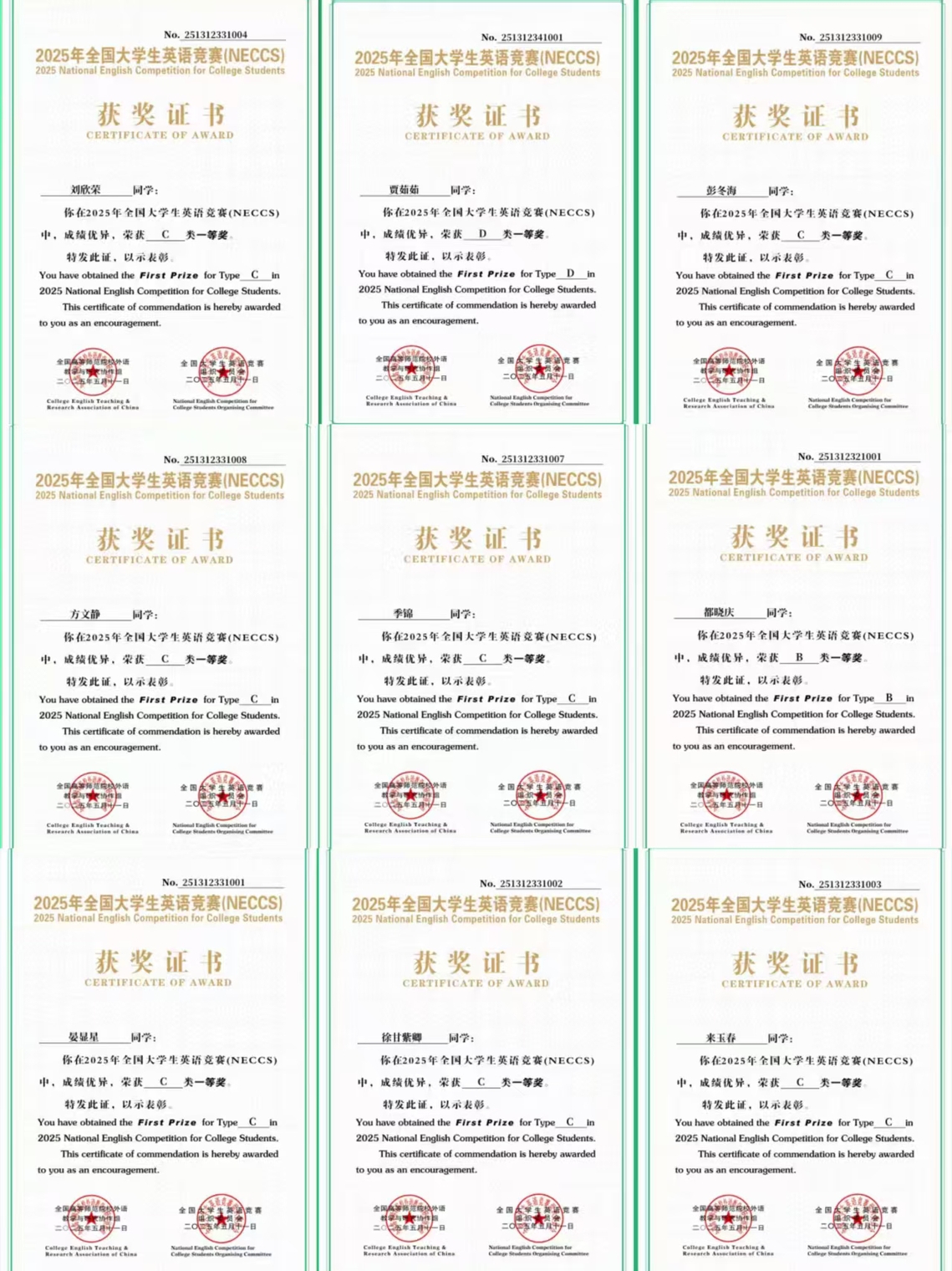 近日,2025 年全国大学生英语竞赛(NECCS)省级竞赛结果正式公布,我校学子凭借扎实的英语功底、出色的综合素养与稳定的赛场发挥,在众多参赛选手中脱颖而出,斩获多项荣誉,充分展现了我校英语教学的卓越成果与学子的昂扬风采。